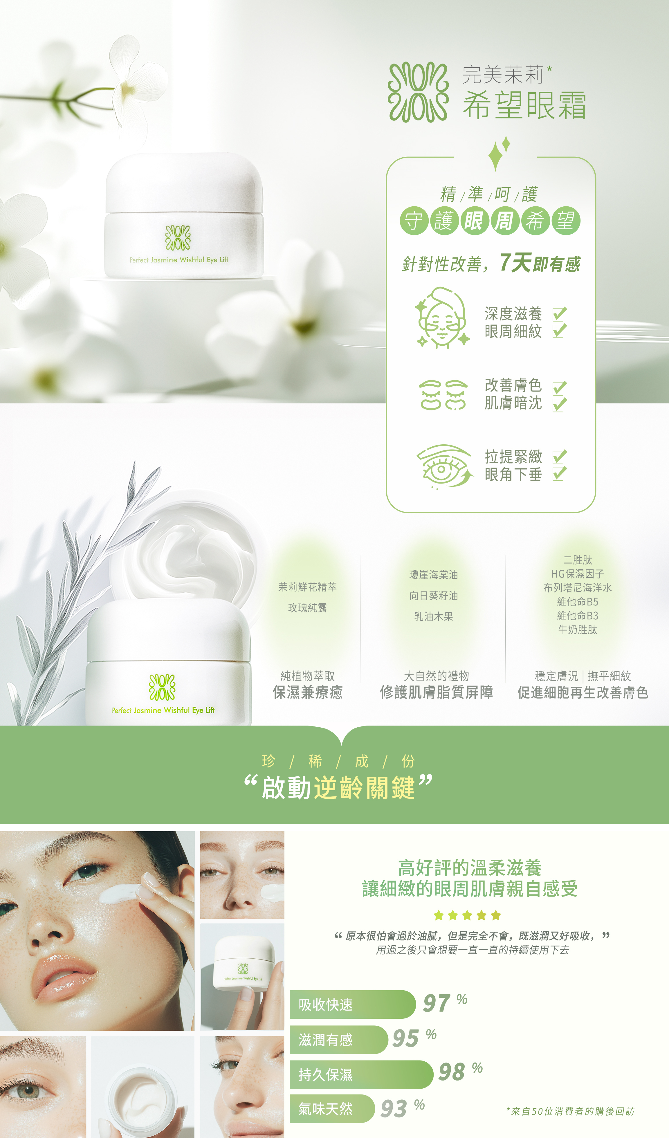 細緻的眼周肌膚只能接收最珍貴的成分和最精準的呵護,因此這裡只有負責修護的瓊崖海棠油和抵擋老化的牛奶胜肽守護眼周的希望。其他的植物性油脂、維他命及專利保濕因子的協同作用,都是為了帶給您在使用時如微風輕拂臉龐的細緻感受
